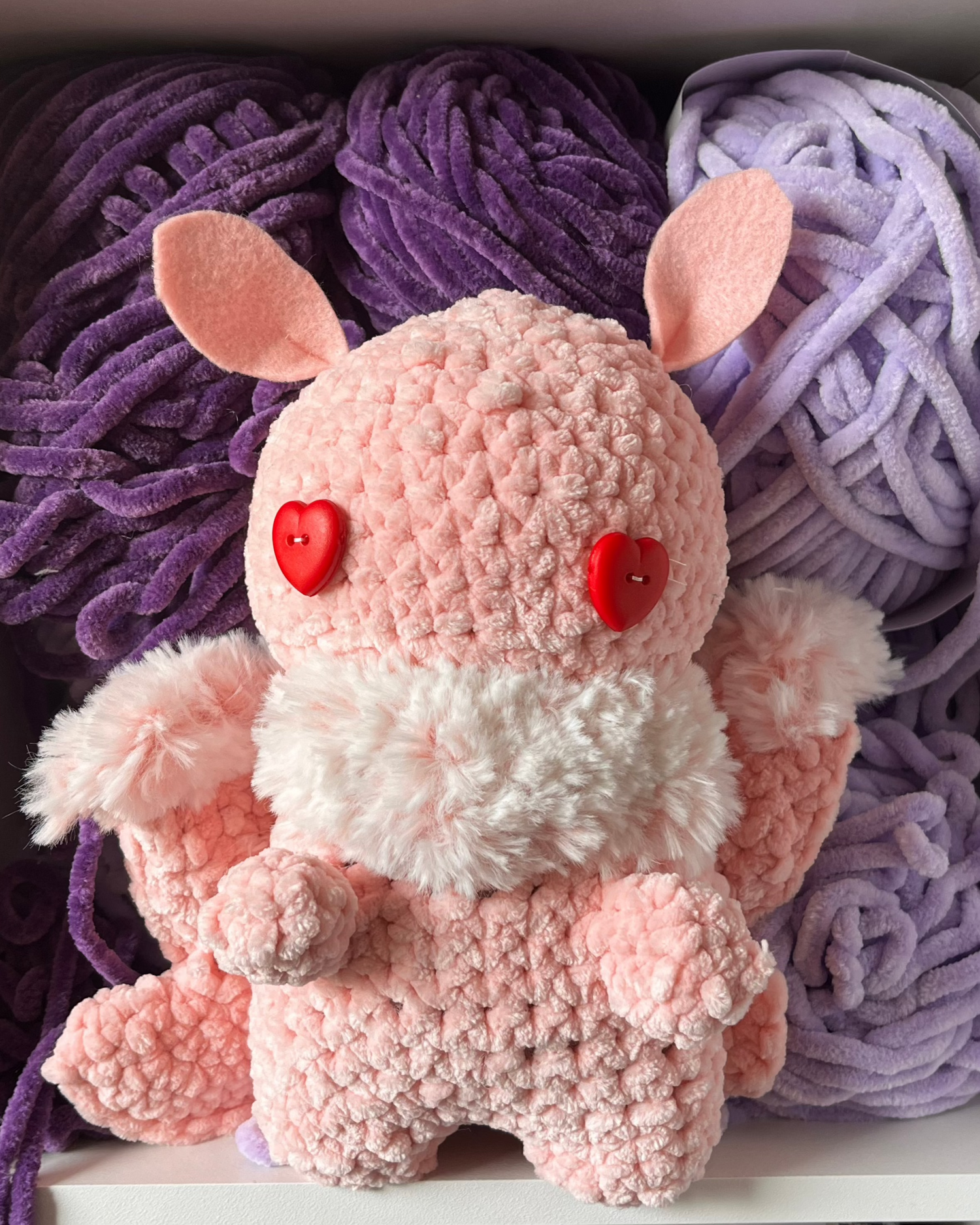 I started crocheting because my partner asked for a pink Moth-man for Valentine’s Day. I crocheted all the parts......and then it took me 5 months to actually finish it because sewing was intimidating.